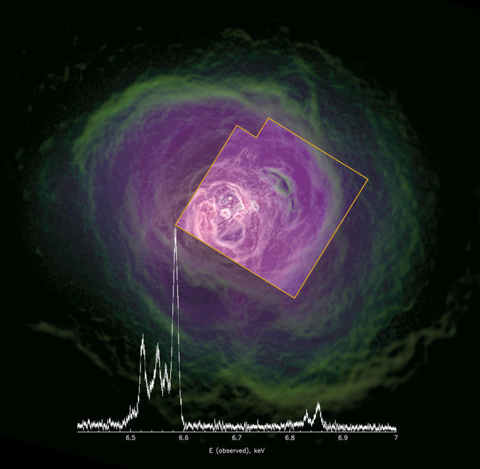 2016年2月に打ち上げられたX線天文衛星「ひとみ(ASTRO-H)」の 観測データを公開しました。全観測リストは こちら。 打上げから約1か月の短い期間ではありましたが、「ひとみ」衛星は貴重なデータを残してくれました。 その一つが、軟X線分光検出器(SXS: Soft X-ray Spectrometer)によるペルセウス座銀河団の観測データです。 「ひとみ」は、過去最高のエネルギー分解能による観測を行い、これまでの20倍以上の精度で高温ガスの運動を測定しました。 また、それによって銀河団中心部のガスの運動を、初めて直接測定しました (Nature, 535, 117, 2016)。