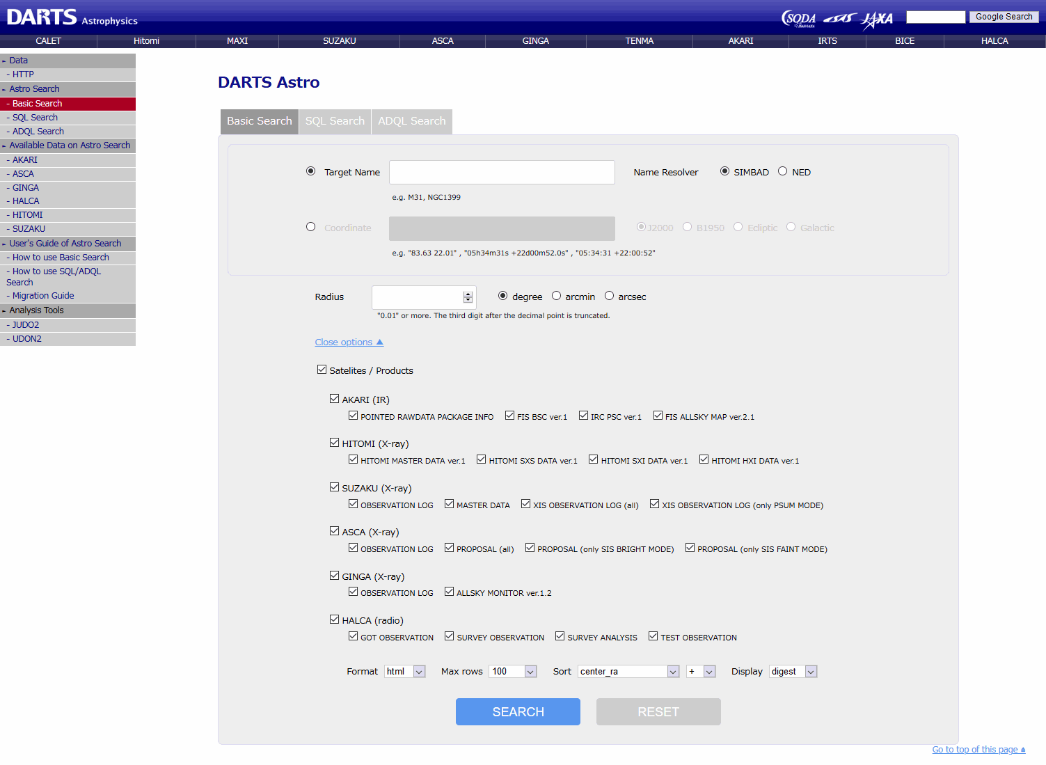 さらに、データベース操作言語 SQL や ADQL を使用して, より自由度の高い検索を行うこともできます。 詳しくは ユーザーガイドをご参照ください。